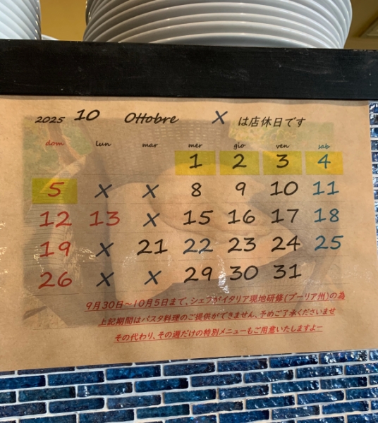 10月後半の営業スケジュール 2025-10-16 12:34:27 『10月のお休みです』10月後半は、20、27、28日が店休日となります。プーリア州、バーリの街に研修に行っていたシェフも戻り、プーリア料理始まってます!