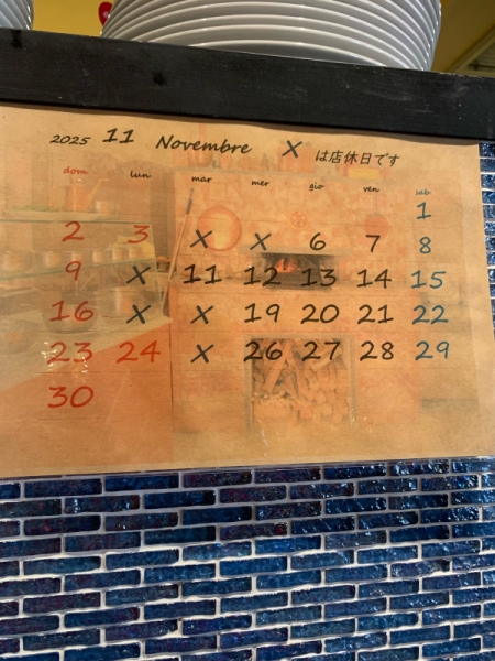ピッツェリア・ナポレターナ ラルデンツァ 11月の営業スケジュールです。