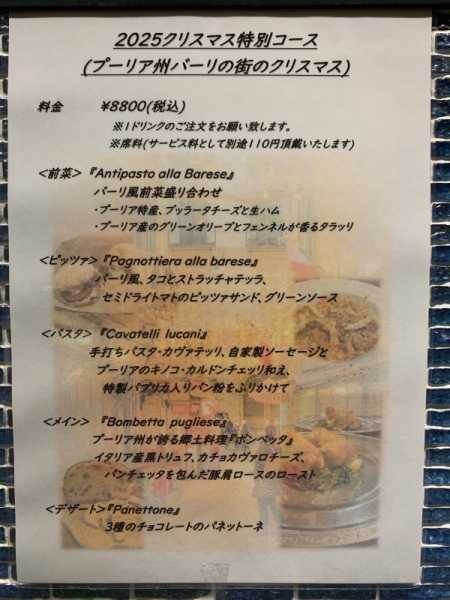 シェフに現地研修に行ってもらったプーリア州バーリの街のお料理を、クリスマス特別バージョンでご用意いたします。