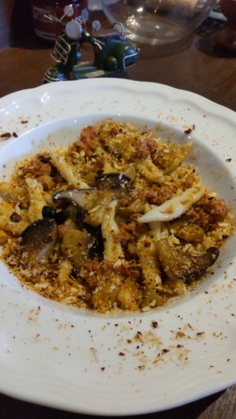〈手打ちパスタ・カヴァテッリ、自家製ソーセージとプーリアのキノコ・カルドンチェッリ、特製パプリカ入りパン粉をふりかけて〉