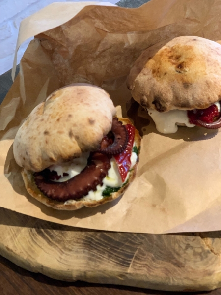 バーリの街といったら『タコ』というくらい、タコに馴染みのある街。現地で食べたタコのパニーニを、ナポリピッツァ生地を使ったホットサンドに再構築。